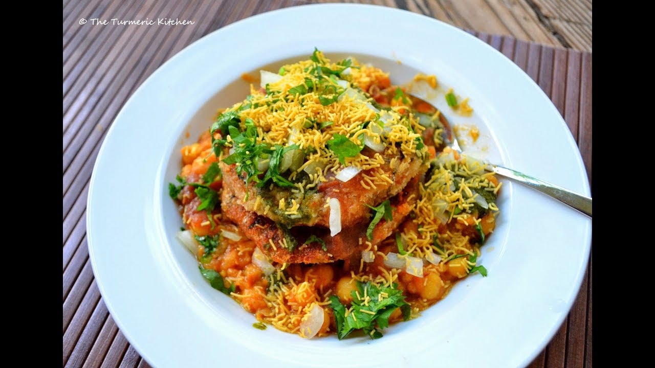 Crispy potato patties topped with chickpeas, sweet yogurt, mint chutney, tamarind chutney, onion, coriander, pomegranate and crispy sev.