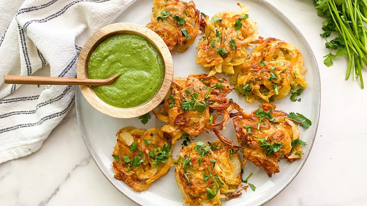 Golden onion fritters topped with chickpeas, yogurt, chutneys, onion, coriander and crispy sev.