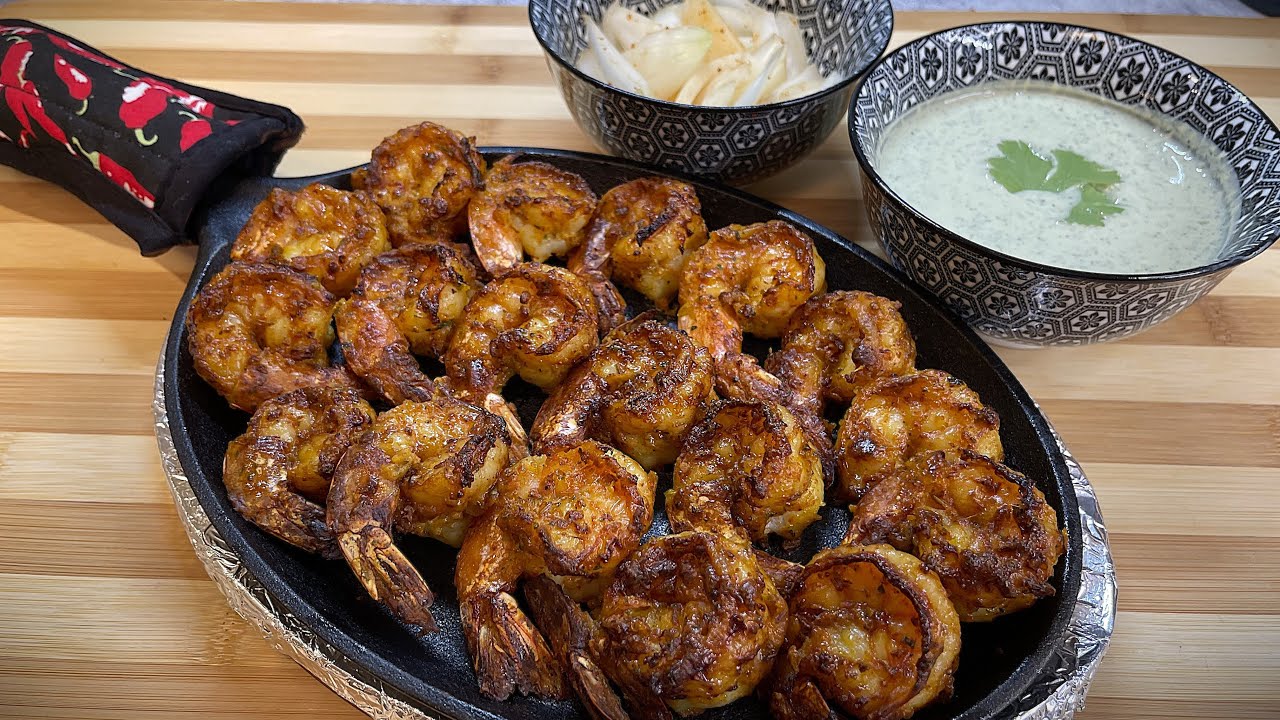 Tiger prawns marinated with yogurt, lemon and Indian spices, grilled and served with fresh onion tomato salsa.