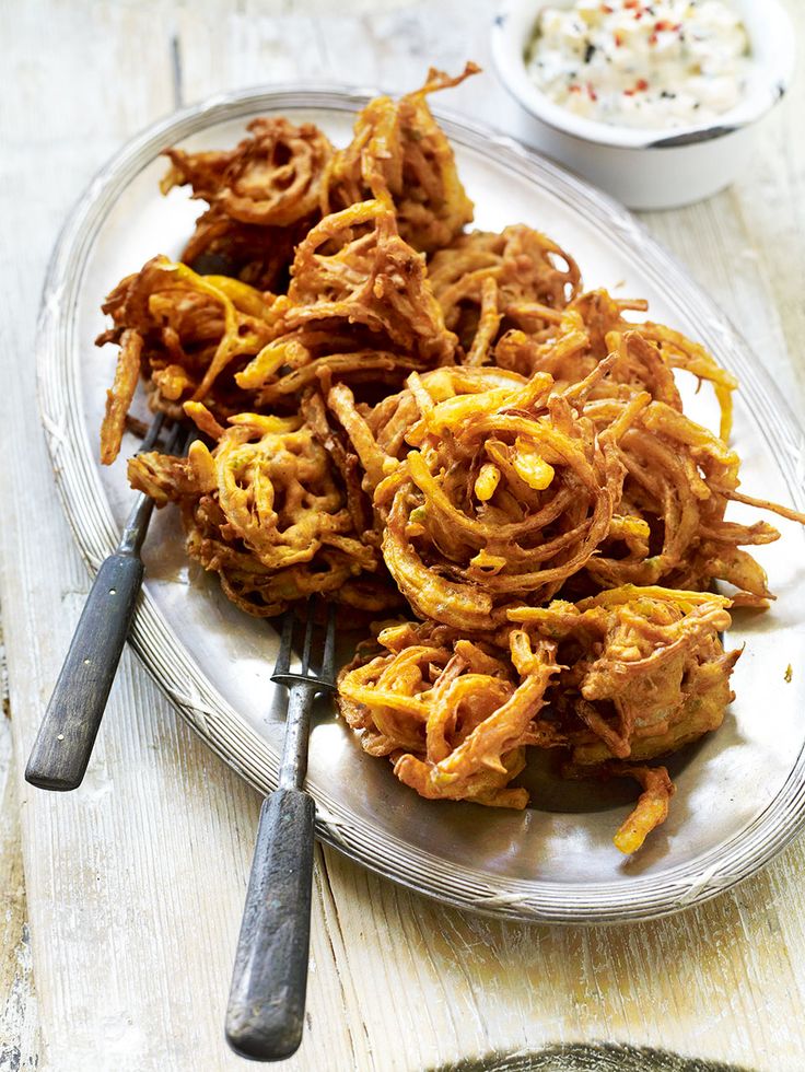 Crispy onion fritters made with gram flour, fennel, ajwain and Indian spices, deep fried and served with mint chutney.