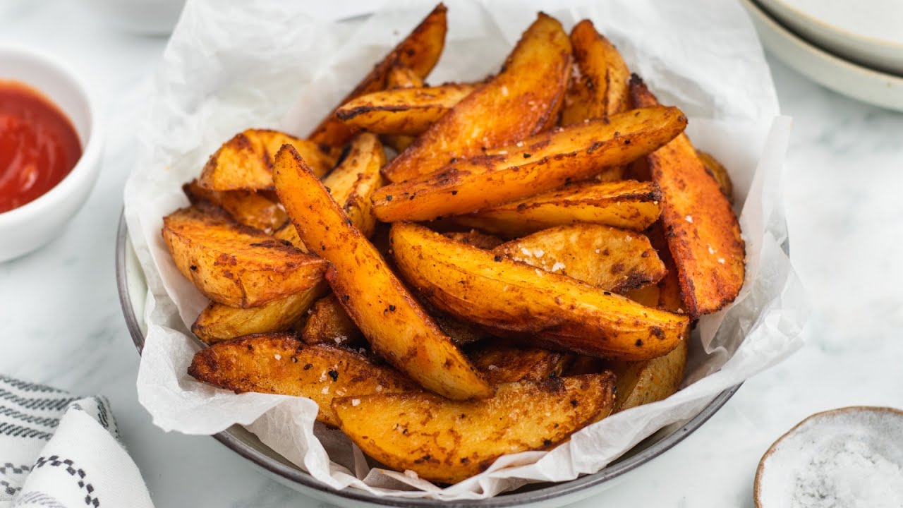 Seasoned potato wedges fried until golden and crispy.
